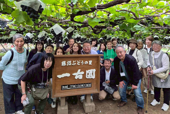 冨士霊園を後にして、山梨県甲州市勝沼町へと移動し、「一古園」にて《ぶどう狩り》と《昼食(甲州ワインビーフ・山梨の郷土料理ほうとう)》でした。その後、卒業生の有賀さんご一族が生産・製造・販売をされておられる「勝沼醸造」に移動し、ぶどう作りからワイン作りのビデオを鑑賞させて頂き、ワインの奥深さを知る事が出来ました。そして、「勝沼醸造」のワインの試飲及び購入をして、「勝沼醸造」を後にして帰路につきました。今回も、世代を超えた交流が出来、また参加者の皆様のご協力を得て大変有意義な一日を過ごす事が出来ました事、感謝致します。 ありがとうございました。