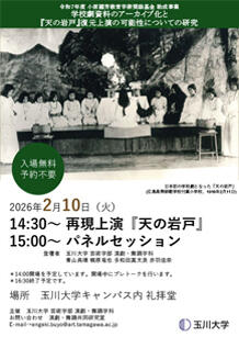 玉川大学 芸術学部 演劇・舞踊学科では、令和7年度 小原國芳教育学術奨励基金 助成事業 学校劇資料のアーカイブ化と『天の岩戸』復元上演の可能性についての研究を進めています。それに伴い、日本初の学校劇となった『天の岩戸』の再現上演及びパネルセッションを行います。