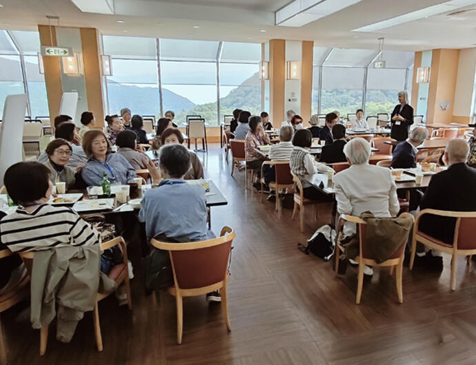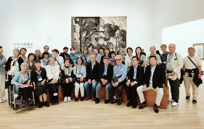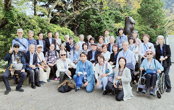 彫刻の森美術館に集合し、ベラフォレスタ(ビッフェ)にて昼食を取りながら再会を祝いました。その後各人のペースで園を散策。ピカソ館に集まり記念撮影を行いました。 幸せを呼ぶシンフォニー彫刻タワーにも登り、ステンドグラスに感動しました。